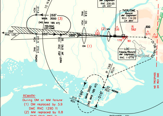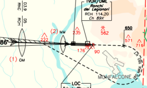Pressoché identica alla ILS-Z RWY 09, ove si eccettui il mancato avvicinamento che qui si svolge proseguendo su TR 086°, quindi, attraversando 650ft, virando a destra (IAS MAX 160kt) per tornare su RDL 266 RCH VOR (TR 266°) verso il circuito d’attesa su LEIRA.