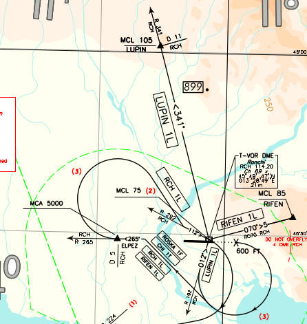 RDL 265 RCH VOR (TR 265°) (a 5NM RCH DME: +5000ft) – RDL 292 RCH VOR (TR 112°) – RCH VOR/DME (+FL75) – RDL 070 RCH VOR – RIFEN (+FL85)