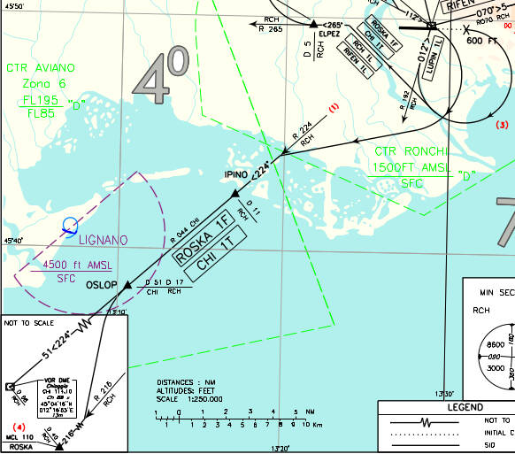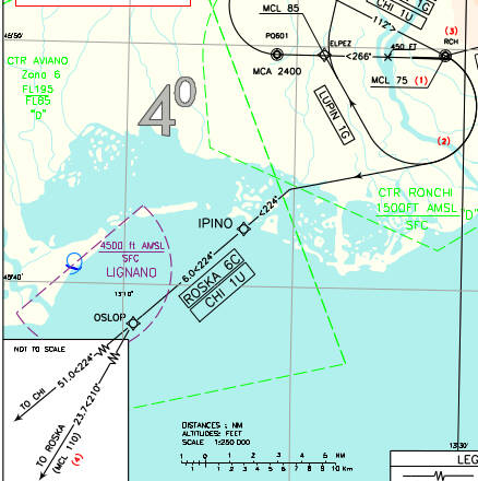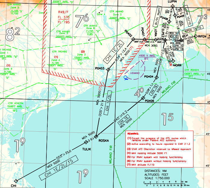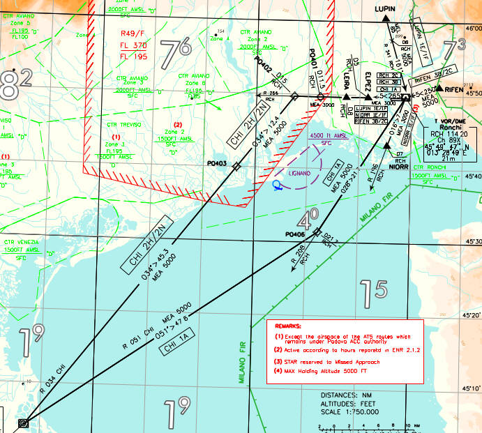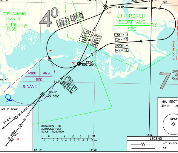 ELPEZ (+5000ft) – TR 176° (tratto non utilizzabile quando la zona acrobatica LIGNANO è attiva) – PQ512 – TR 266° – PQ513 (+4000ft) – TR 356° – PQ401 (IF. +3000ft).