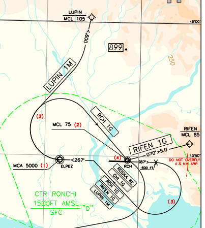 RDL 192 RCH VOR (TR 012°) – RCH VOR/DME (+6000ft) – RDL 341 RCH VOR – LUPIN (+FL105)