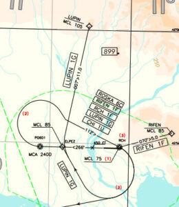 TR 266° (+450ft, IAS MAX 240kt /bank angle 25°/ IAS MAX 185kt (bank angle 15°) – PQ601 (flyover waypoint, +2400ft) – TR 112° – RCH (+FL75) – TR 070° – RIFEN (+FL85)