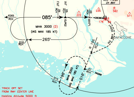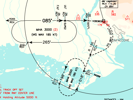 Mancato avvicinamento proseguendo su TR 086°, quindi, attraversando 650ft, virata a destra (IAS MAX 160kt) per intercettare RDL 196 RCH VOR verso il circuito d’attesa sul punto NIORR (inbound 016°/outbound 196°, +3000ft, IAS MAX 185kt).