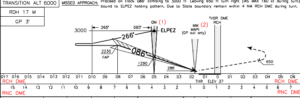 MAPt (GP INOP) sul MM (sostituito da 0.8NM RNC DME, +286ft) e mancato avvicinamento proseguendo su TR 086°, quindi, attraversando 650ft, virando a destra (IAS MAX 160kt) per tornare su ELPEZ e il suo circuito d’attesa.
