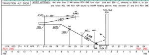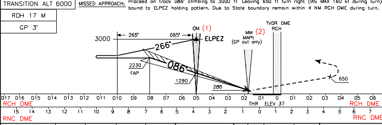 Da ELPEZ, dove è attestato un circuito d’attesa (inbound 085°/ outbound 265°, +3000ft (-5000ft), IAS MAX 185kt), racetrack outbound su TR 266°, quindi virata base a destra su TR 086° fino al FAP a 8NM RCH DME (+2230ft) e segmento finale su TR 086°.