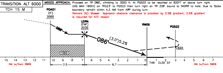 MAPt su THR RWY 09 (flyover waypoint) – TR 086° fino a PQ522 (+620ft, flyover waypoint) – virata a destra (IAS MAX 160kt, not standard ICAO for CAT D ACFT) su TR 223° fino a PQ523 – TR 236° verso NIORR ed il suo circuito d’attesa RNAV1 (flyover waypoint, inbound 056°/outbound 236°+3000ft, IAS MAX 185kt)