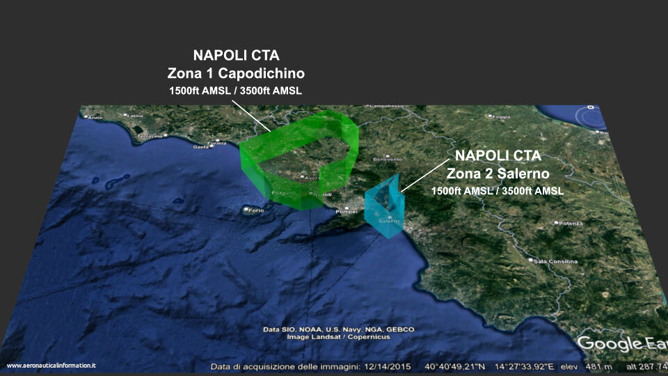 Dai limiti laterali e verticali della CTA di Napoli devono intendersi escluse le zone vietate, regolamentate, pericolose e temporaneamente riservate, quando attive.