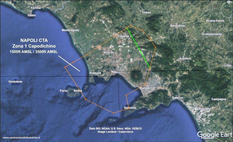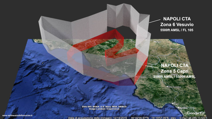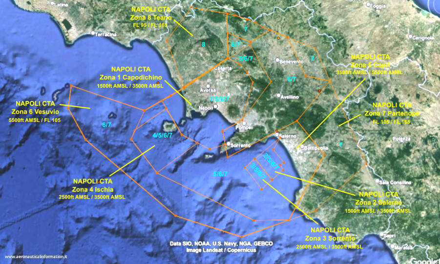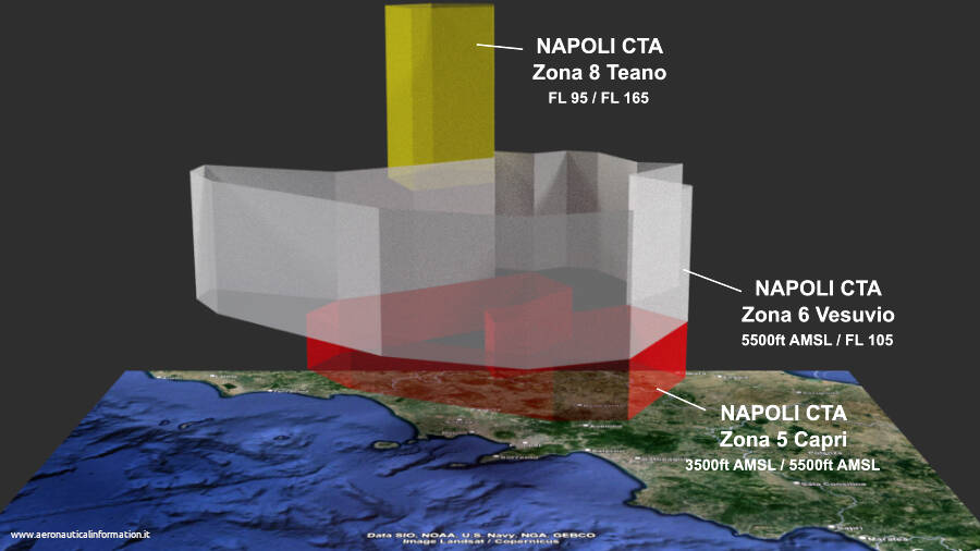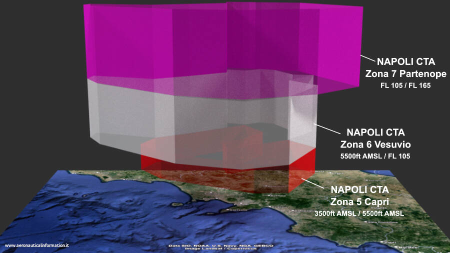 Per concludere, occorre aggiungere che al di sopra della CTA di Napoli si estende ancora lo spazio aereo controllato della zona 5 della Control Area di Roma “Campania”, con limiti verticali che vanno da FL 165 fino a FL 195.