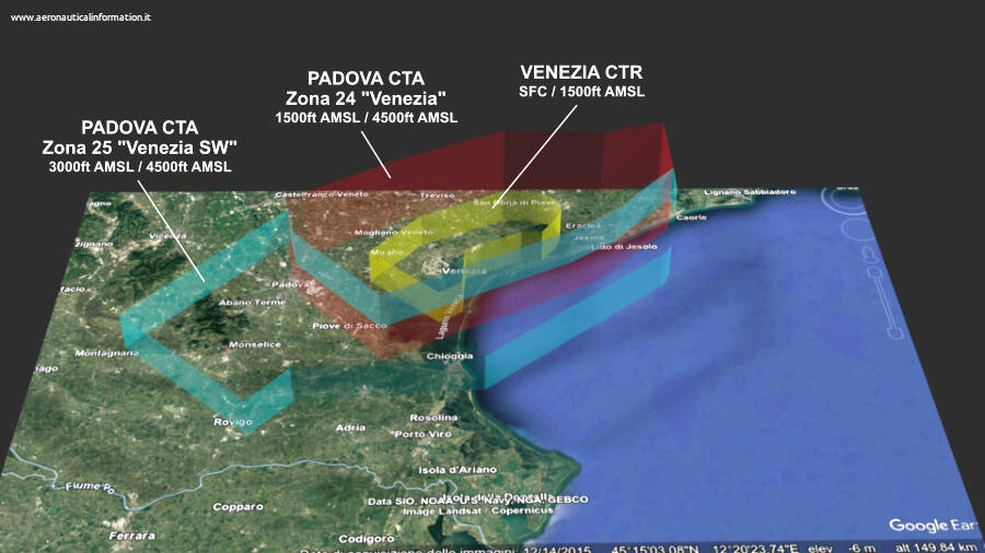 La Control Area di Padova sovrasta la CTR di Venezia, segnatamente con la zona 24 “Venezia” della CTA, istituita con l’AIRAC A11/23, in vigore dal 28 Dicembre 2023.