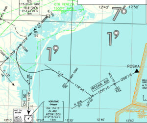 TR 042° – PZ488 (+750ft, IAS MAX 200kt) – TR 095° – PZ489 (+3400ft or +5000ft if military firing area VENEZIA is active, IAS MAX 200kt) – TR 129° – PZ497 (+5000ft) – ROSKA (+FL90)