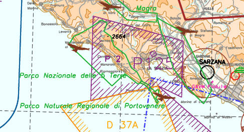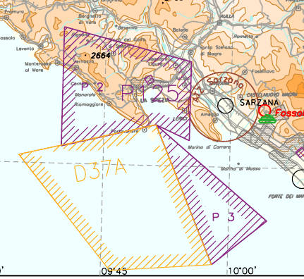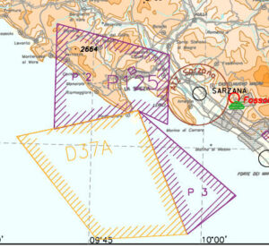 devo segnalare che l’area è quasi completamente contenuta nella zona vietata LI P2 “La Spezia” (all’interno della quale il traffico aereo civile è proibito senza eccezioni) e in quello della zona pericolosa LI D37/A “Portovenere” (dove si effettuano esercitazioni di tiri a fuoco dal Lunedì al Venerdì H24).