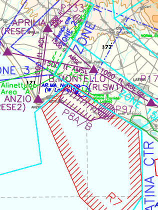 Situata a Sud/Ovest dell’aeroporto di Latina, essa interferisce con la CTR di Latina, nonché con la TMA e la CTA di Roma.