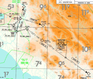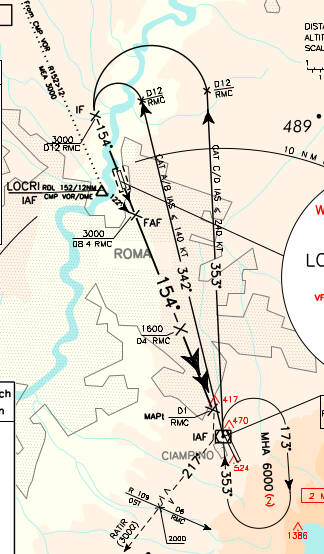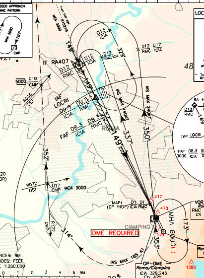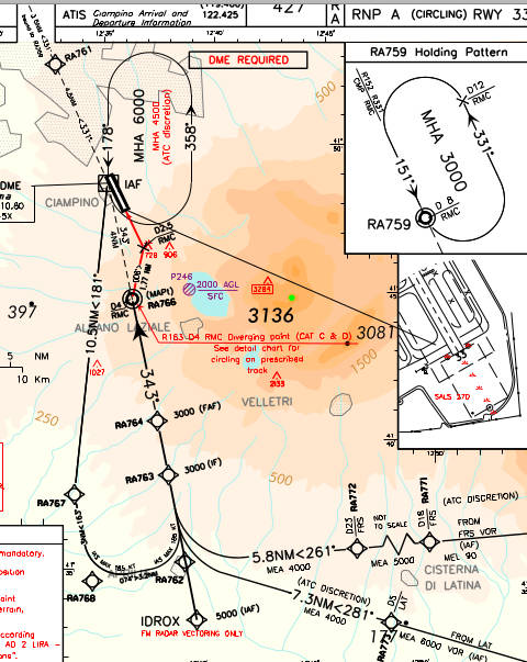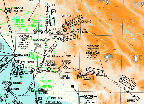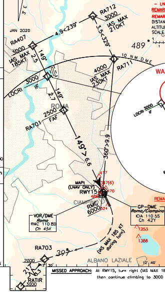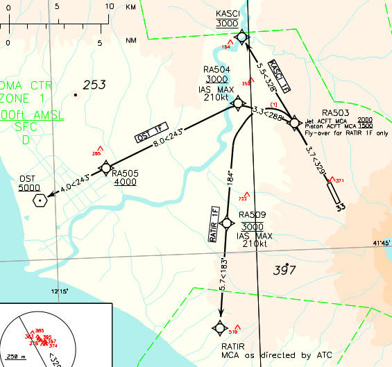 TR 329° – RA 503 (flyover waypoint, +2000ft o +1500ft per aeromobili on motore a pistoni) – TR 184° – RA509 (+3000ft, IAS MAX 210kt) – TR 183° – RATIR (MCA as cleared by ATC)