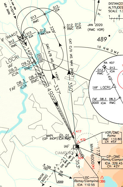 Tratto outbound su TR 350° (CAT C/D IAS MAX 240kt) o su TR 337° (CAT A/B IAS MAX 140kt). A 12 NM RMC o ICIA DME, virata a sinistra per presentarsi all’IF RA407.
