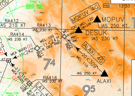 MOPUV – TR 236° – DESUK (+FL120) – TR 242° – RA413 (+FL100) – RA414 – RMC (+6000ft o +4500ft a discrezione ATC)