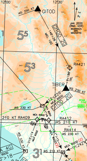 GITOD – TR 146° – RA421 (+FL100) – TR 186° – TIBER (+TRL) – TR 229° – CMP (+6000ft) – TR 151° – RA412 – RMC (+6000ft or +4500ft at ATC discretion)
