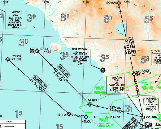 OST VOR/DME (+5000ft) – RDL 278 OST VOR – NENIG – RDL 130 ELB VOR (TR 310°) – GILIO (+FL200 per aeromobili diretti a LIML via Q704; +FL100 per gli altri)