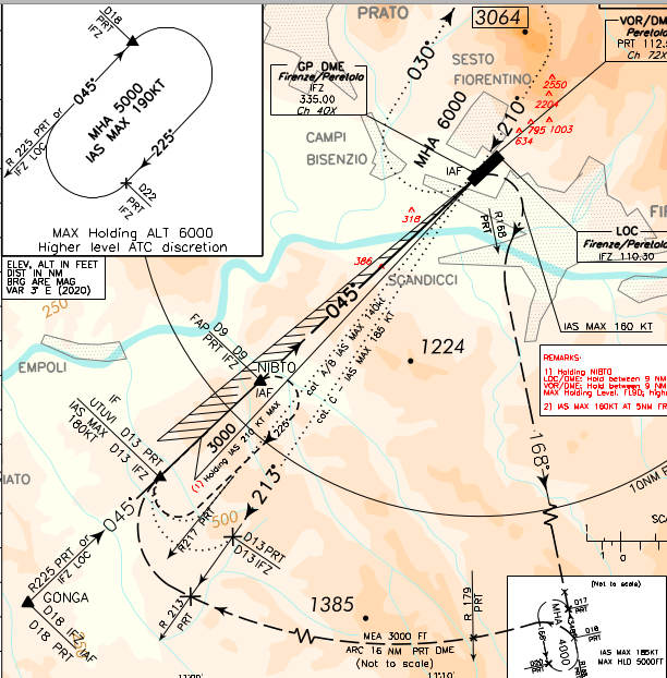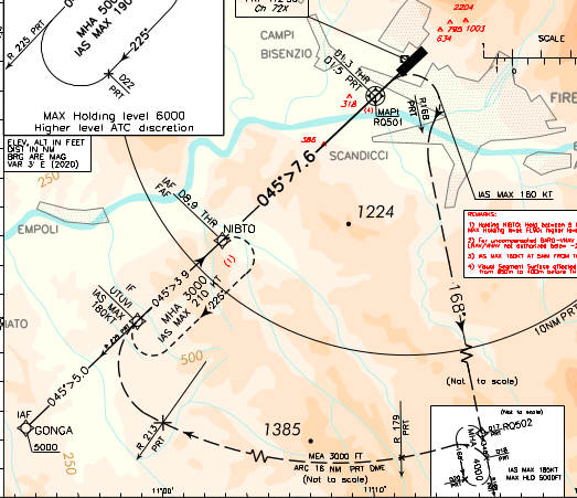 Le procedure descritte nella carta conducono allo IAF sul waypoint NIBTO, sul quale è attestato anche un circuito d’attesa di tipo convenzionale:
