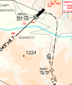 Mancato avvicinamento con virata a destra (IAS MAX 160kt) prima della soglia 05 ma non prima di 1NM IFZ DME. Intercettare RDL 168 PRT VOR fino al circuito d’attesa che si svolge fra 17NM e 20NM (inbound TR 348° IAS MAX 185kt MHA 4000ft – MAX holding ALT 5000ft)