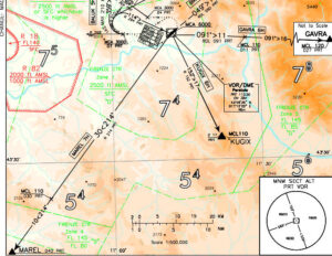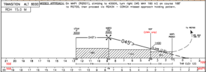 RQ601 (flyover WPT; +3500ft, IAS MAX 210kt ) – TR 215° – GINAR (+6000ft) – TR 196° – AKUTO (+FL110) – RQ613 – MAREL