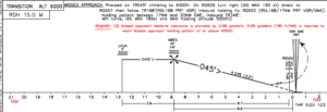 MAPt su RQ501 (flyover waypoint, +940 for LNAV only) e mancato avvicinamento con virata a destra (IAS MAX 160kt) su TR 168° fino a RQ700, quindi TR 258° – RQ434 (+4000ft, IAS MAX 210kt) – TR 315° – GONGA e il suo circuito d’attesa.