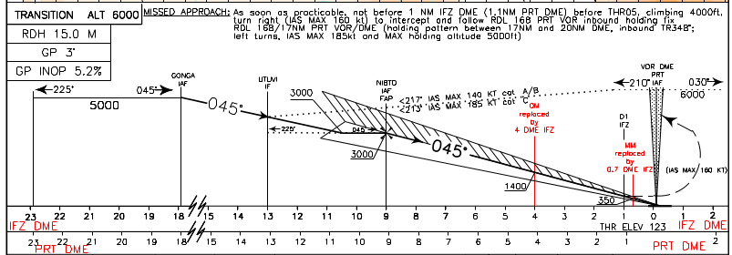 GONGA (+5000ft) – RDL 225 PRT VOR (TR 045° IFZ LOC) – UTUVI (IF) – NIBTO (FAP +3000ft) – segmento finale su 045°