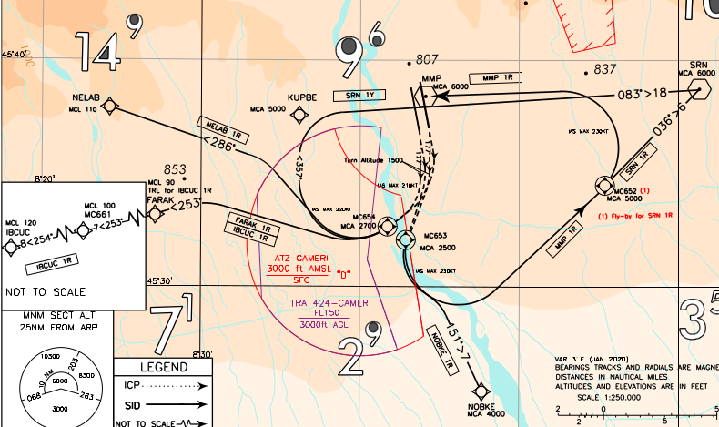 NOBKE (+3000ft) – TR 276° – MC521 (+6000ft) – MC522 (+FL100) – TR 275° – IBCUC (+FL120) – TR 297° – MC523 (+FL145) – MC524 (+FL180) – AOSTA (+FL180/FL190 depending on Geneve QNH)