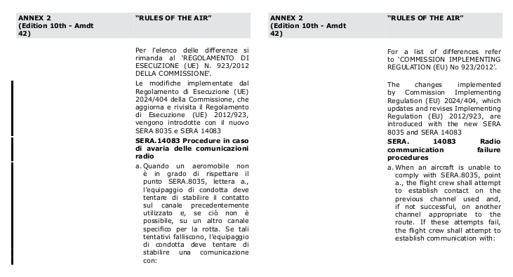 In conformità al Regolamento di Esecuzione (UE) 2024/404 della Commissione, che aggiorna e rivisita il Regolamento di Esecuzione (UE) 2012/923, vengono introdotte con il nuovo SERA.8035 e nuovo SERA.14083, le nuove procedure di avaria delle comunicazioni radio (RCF), per cui gli utenti dello spazio aereo, i fornitori di servizi di