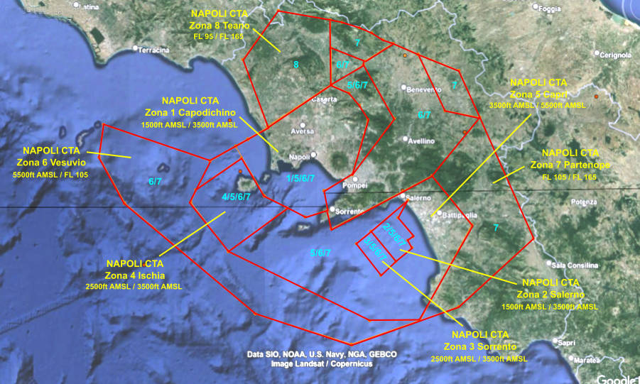 Per concludere, occorre aggiungere che al di sopra della CTA di Napoli si estende ancora lo spazio aereo controllato della zona 5 della Control Area di Roma “Campania”, con limiti verticali che vanno da FL 165 fino a FL 195.